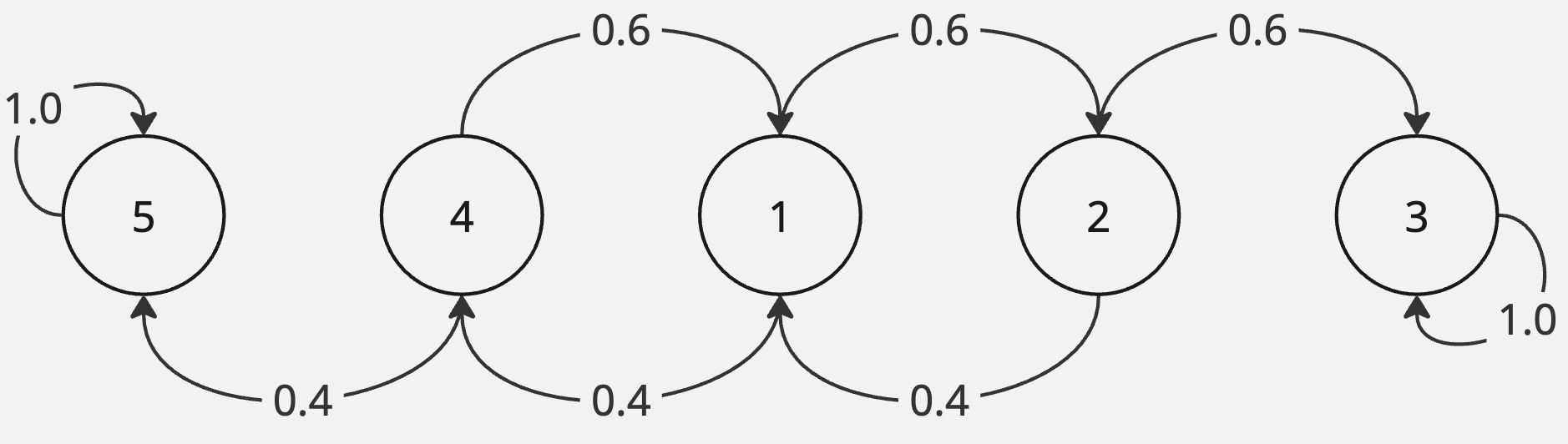 Let the state \(s_1 \stackrel{def}{=}\) the two players are 40-40. And the state \(s_3 \stackrel{def}{=}\) player \(1\) wins. The states \(3\) and \(5\) are absorbing states. Let \(p_{13}\) be the hitting probability of state \(3\) from state \(1\). We have: