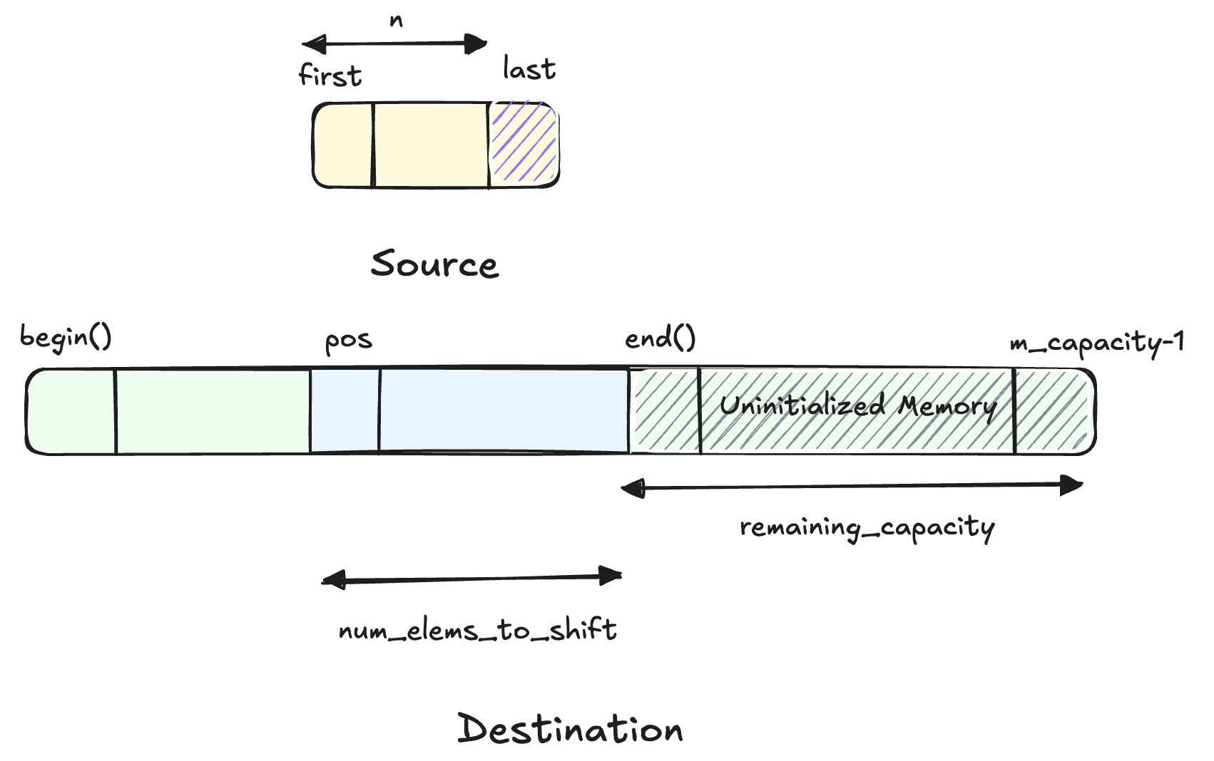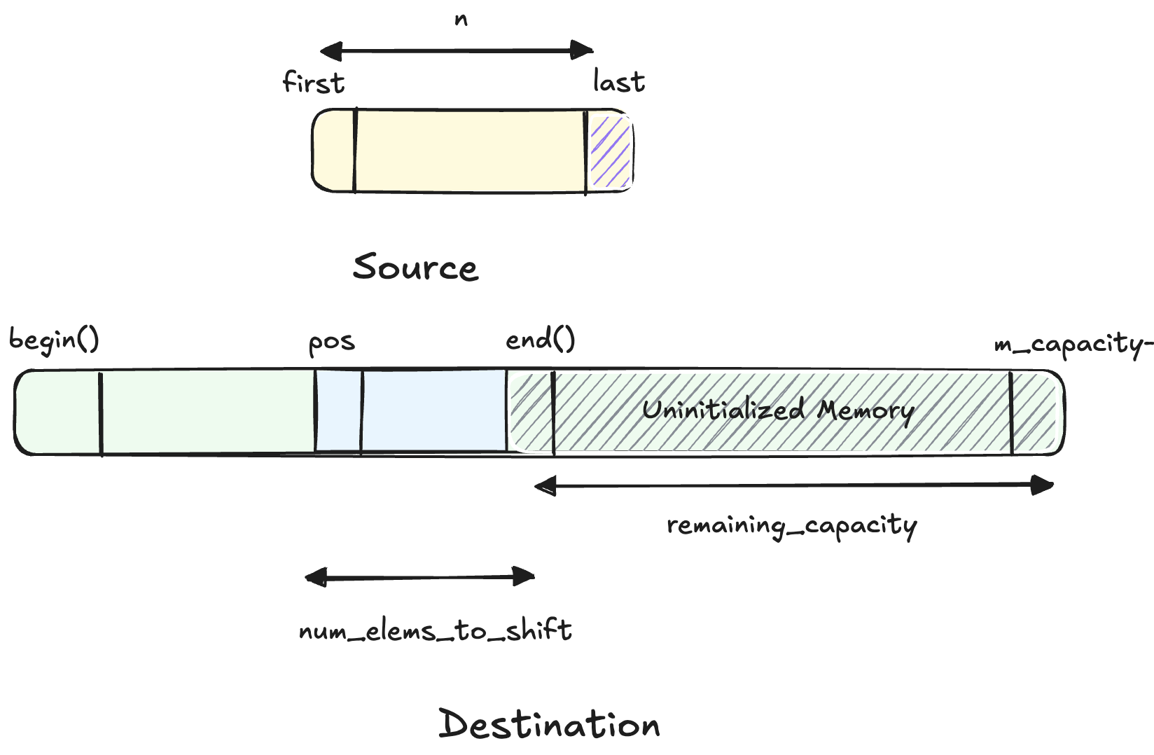 In this case, let’s define num_tail as the trailing number of elements from the source range [first,last) that would be copied/moved to uninitialized memory. Clearly, num_tail = std::max(n - end() + pos,0). So, the tail [last-num_tail,last) will be mapped to [end(),end()+num_tail) upon insertion.