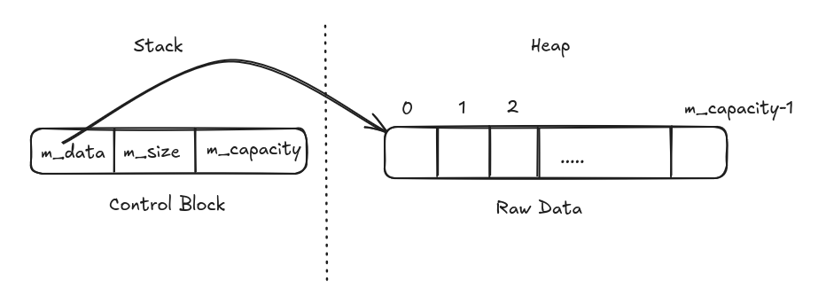 The internal representation of a vector like type has a book-keeping node that consists of: - A pointer to the raw data (a block of memory that will hold elements of type T) - Size of the container(the number of elements in the container) - Capacity