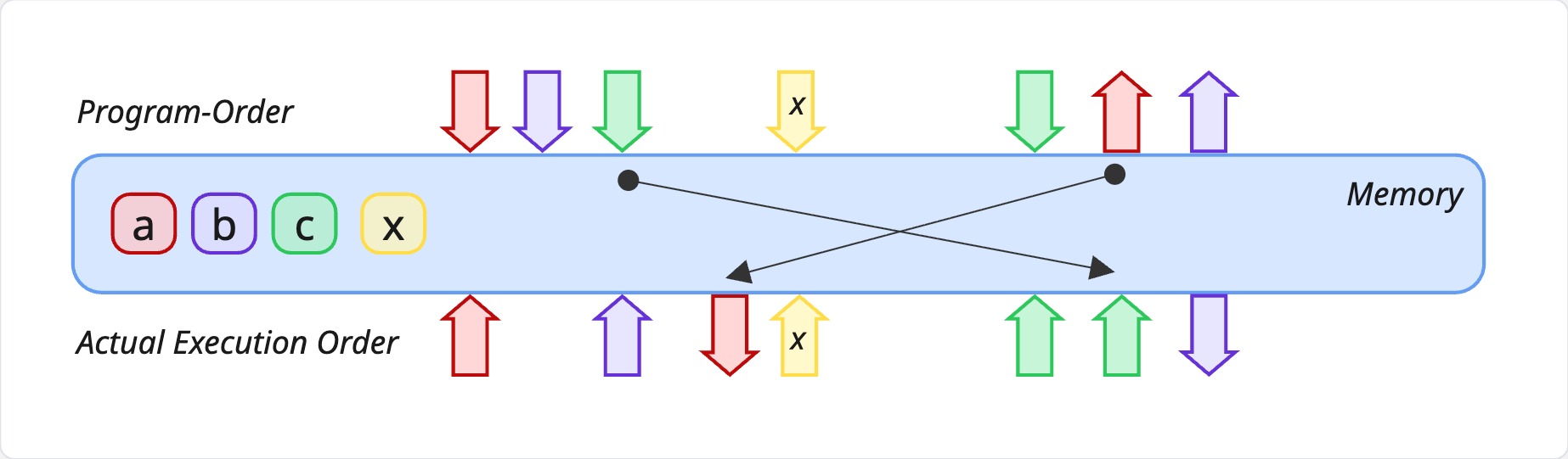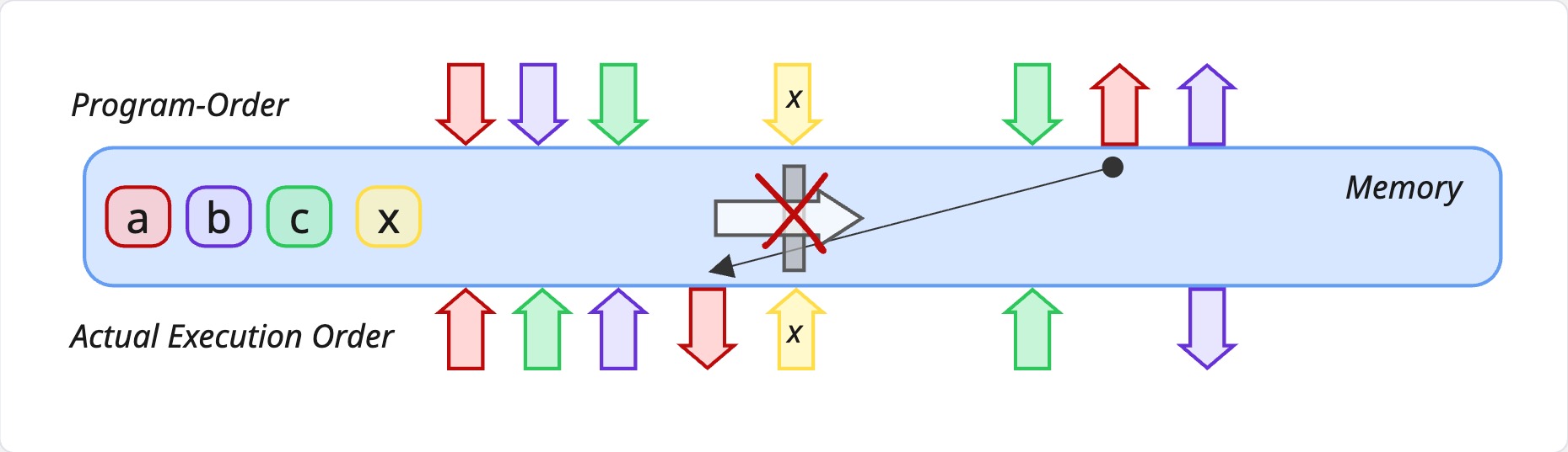 We have an atomic store to x in the middle. In the program order, I write to a, then I write to b, then I write to c and then I write to x. In the actual order, anything is possible. There are no restrictions whatsoever. This in C++ stamdard is called std::memory_order_relaxed. There are no guarantees here.