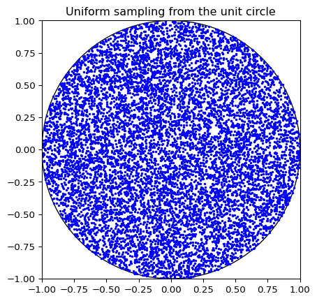 import numpy as npimport matplotlib.pyplot as pltimport matplotlib.patches as patchesu = np.random.uniform(low=0.0, high=1.0, size=10000)r = np.sqrt(u)theta =2*np.pi*np.random.uniform(low=0.0, high=1.0, size=10000)x = r * np.cos(theta)y = r * np.sin(theta)# Create fig and axesfig, ax = plt.subplots()# Use patches.Circle() to create the circle. The xy argument is a tuple for the center (x,y) and radius is a floatcircle = patches.Circle((0.0, 0.0), radius =1.0, fill=False)# Add the circle to the axesax.add_patch(circle)# Add the (x,y) samples to the axes using the 'scatter' methodax.scatter(x, y, color='blue', s=2.5)# Ensure the aspect ratio is equal so the circle isn't distortedax.set_aspect('equal', adjustable='box')# Set the plot limitsax.set_xlim(-1,1)ax.set_ylim(-1,1)plt.title('Uniform sampling from the unit circle')plt.show()